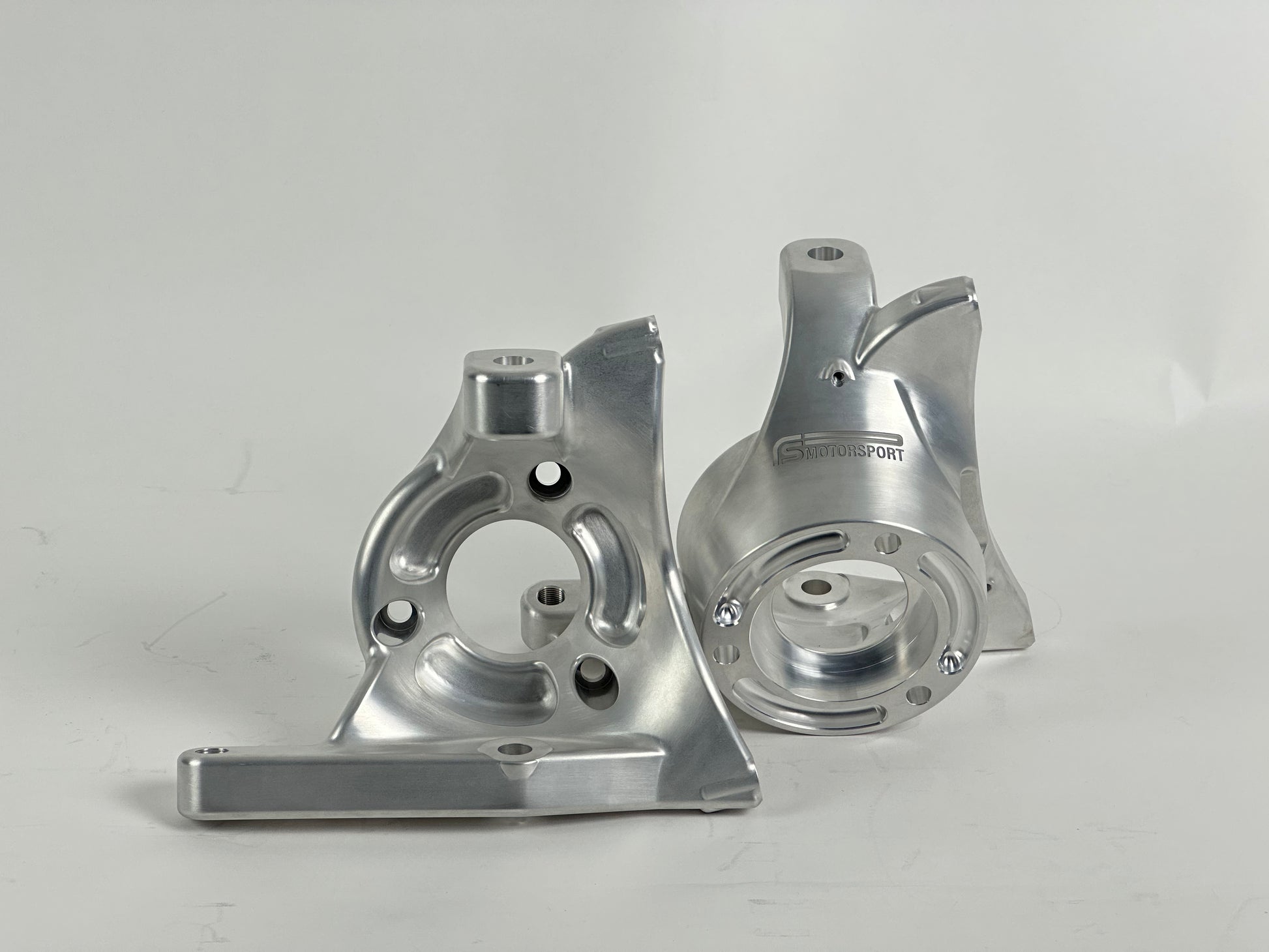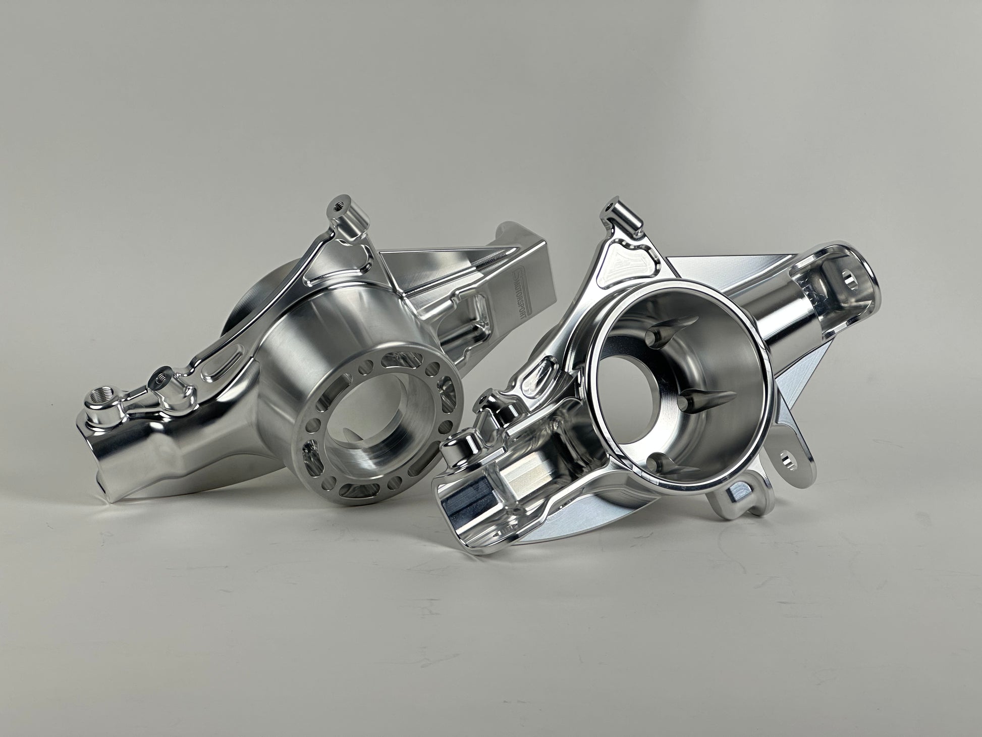 These suspension uprights were designed and built for use on our in house built tube chassis Trans Am race car. Bridging the gap between style and functionality they have been elegantly designed to be used with double A-Arm suspension. These uprights were designed to fit the previous generation Nascar cup brake packages, to fit the maximum amount of stopping power under a modest 16" wheel.